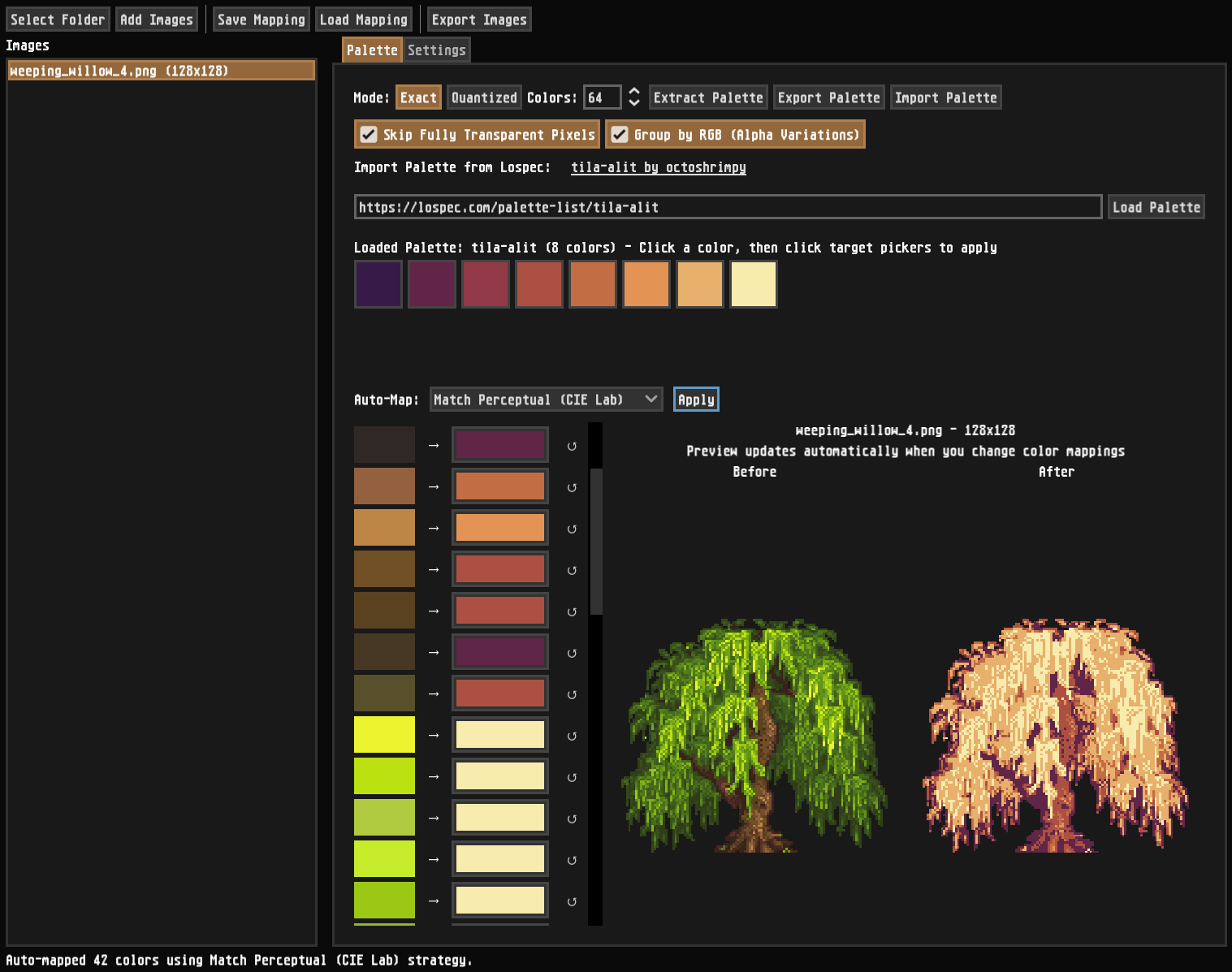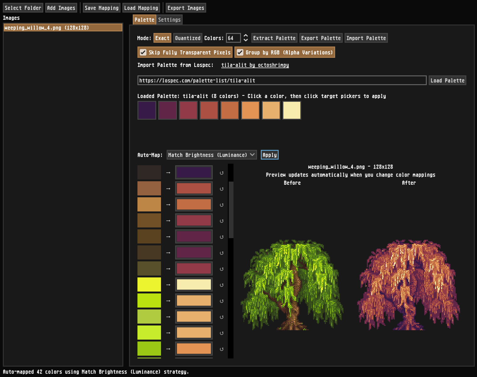 A desktop utility application built with Godot 4.5 for batch colour palette remapping of images. Useful for game developers, pixel artists, and designers who need to quickly retheme sprite sets or apply colour transformations to multiple images at once.
